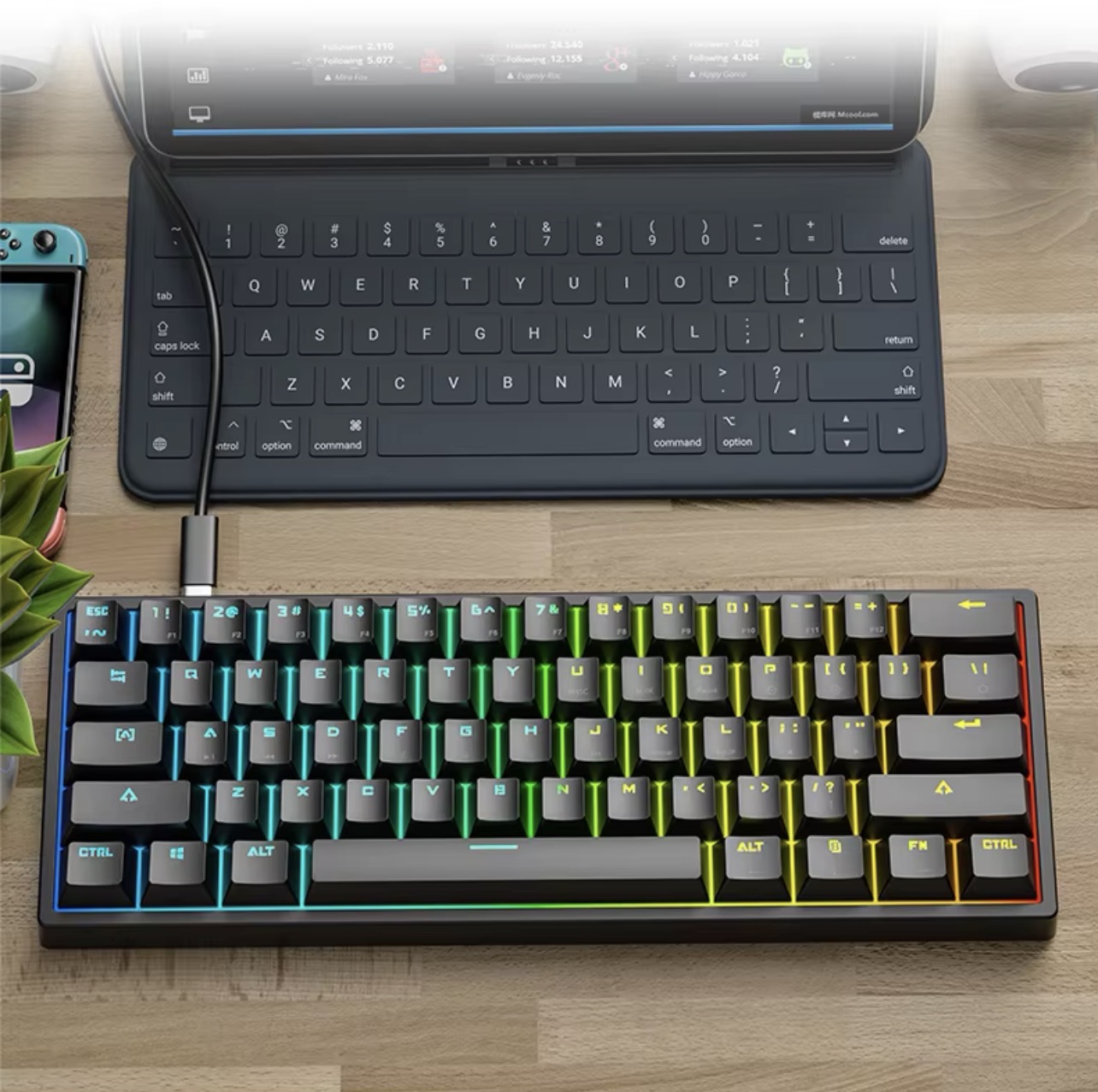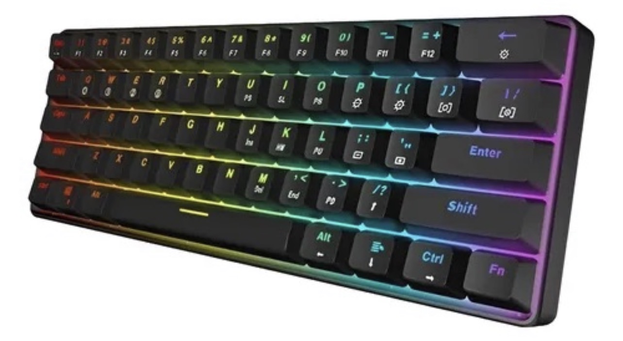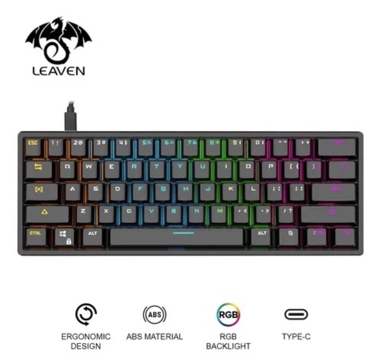 Teclado Leaven k620 60% con cable de diseño nuevo y ultraportátil, diseño ultracompacto y cable desmontable, estilo fresco, 61 teclas compactas, soporte antideslizante bípedo. Cuando juegas juegos intensos, los pies antideslizantes pueden fijar firmemente el lugar del teclado, impresionante iluminación RGB, impresionantes barras de luz luminosas RGB de doble cara (se pueden apagar) Y 9 modos de luz luminosa (se pueden apagar), eligiendo su propio modo preferido para cualquier reproducción, en línea con un diseño ergonómico, ligero y cómodoPortátil. El teclado adopta la interfaz Type-C/USB-C, diseño de cable independiente.